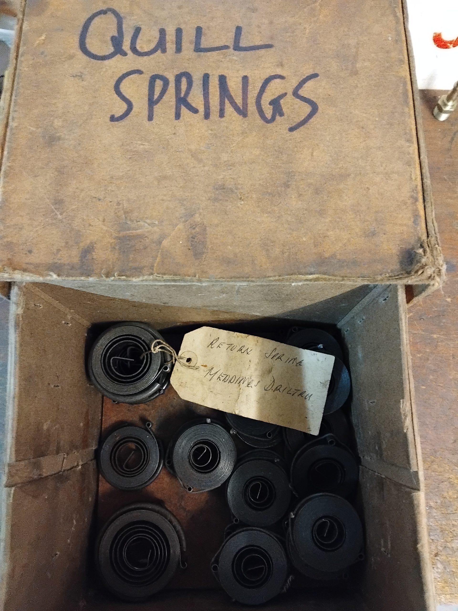 Pictured is a box of various different new replacement original quill return springs to suit drills such as Meddings L1 & L2, Meddings Drilltru, Meddings MF/B 4 & 5 and several others for Meddings and probably some for Fobco’s. You need to confirm the outside diameter & depth, this will be found by measuring the housing the spring locates in. Prices are between £29-49 each Inc. post depending on type. I’m happy to look so please enquire.