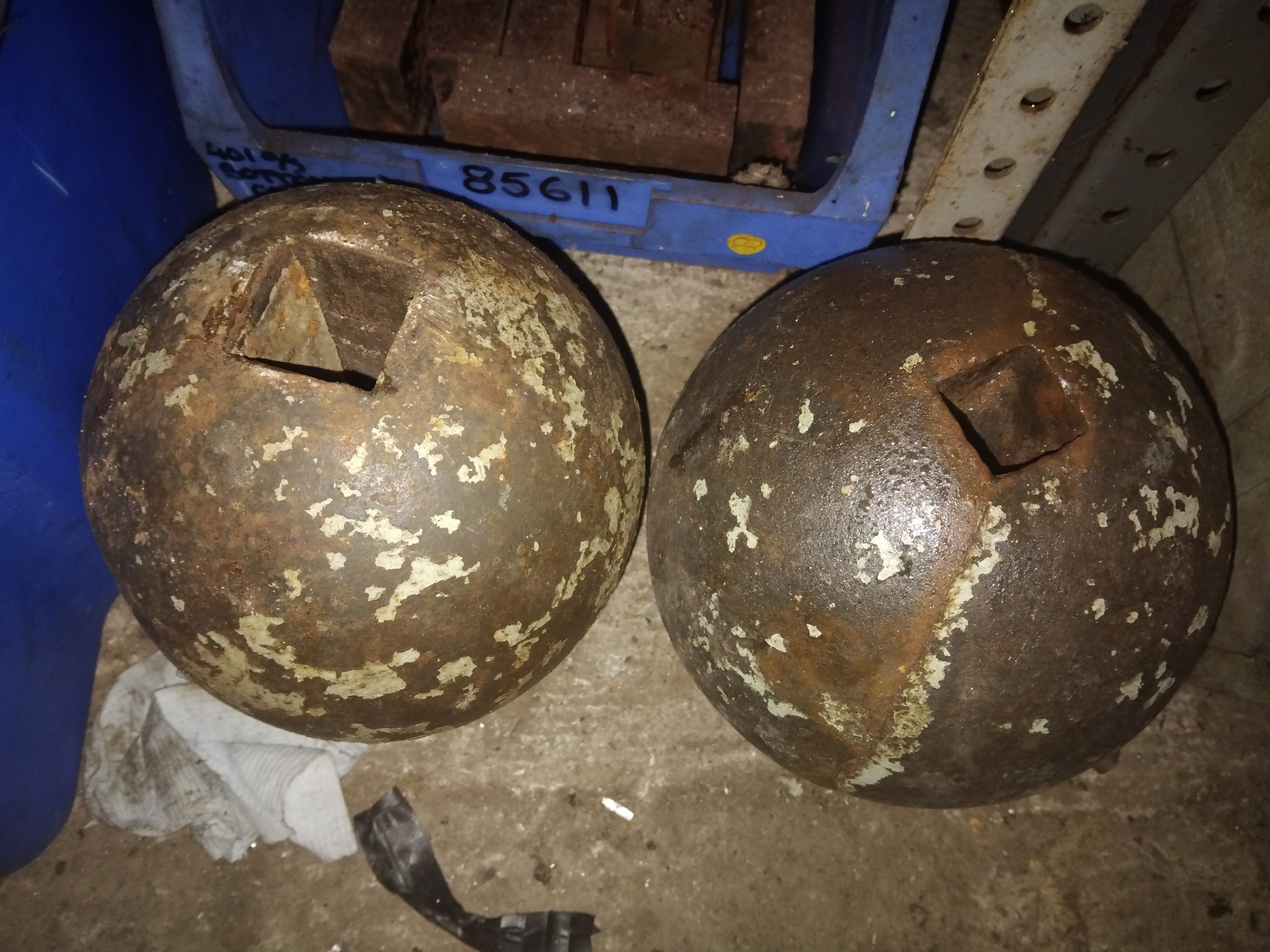 Two off 6″ diameter cast fly press ball weights, each having a square tapered hole in the centre, one is 1″ at the larger end the other is 1 3/8″. £25 each or £45 the pair.
