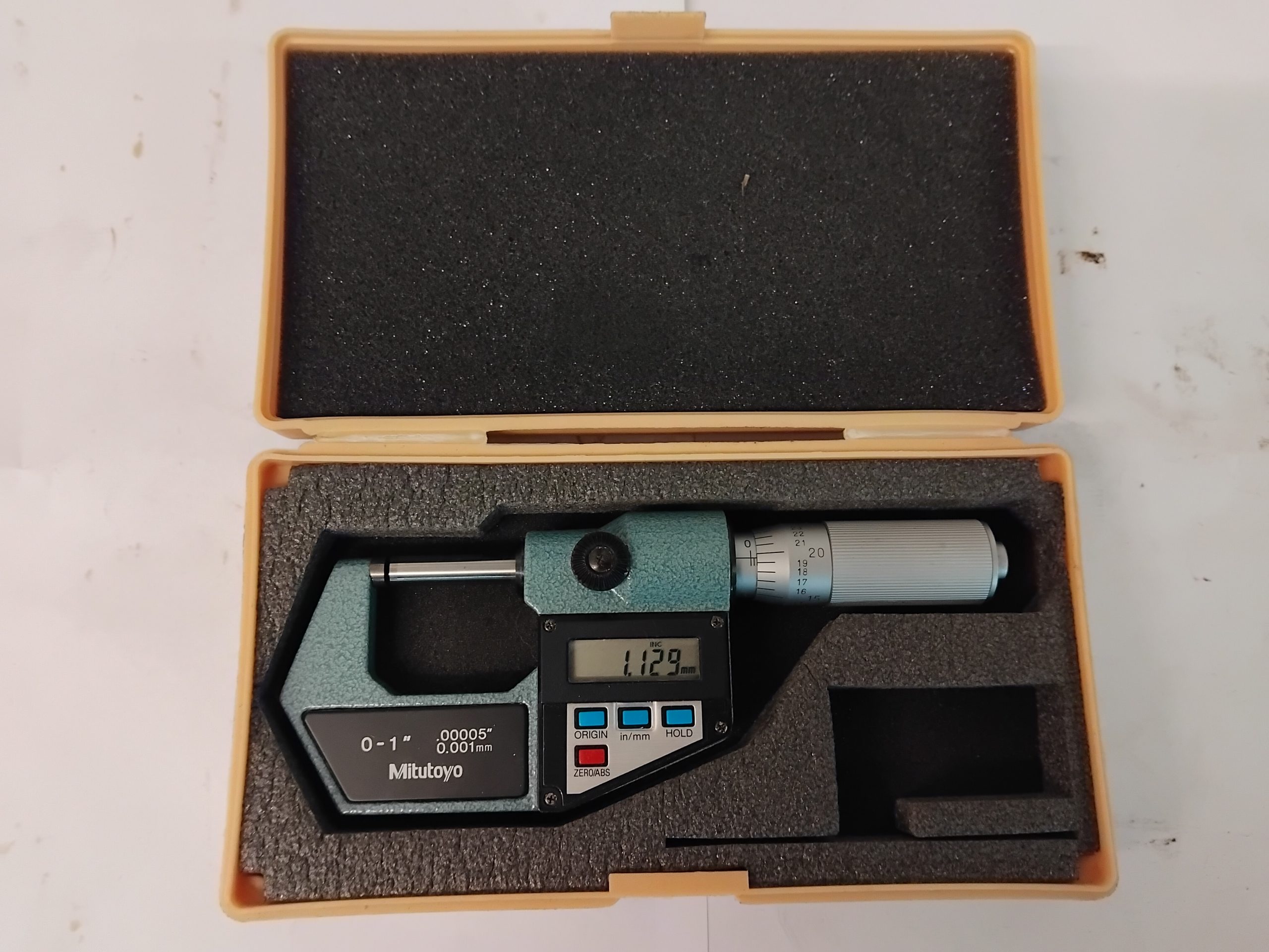 Boxed model 293-766-10 digital mic to read 0-25mm or imperial 0-1″, reads to 1 micron! Pristine condition with new battery.