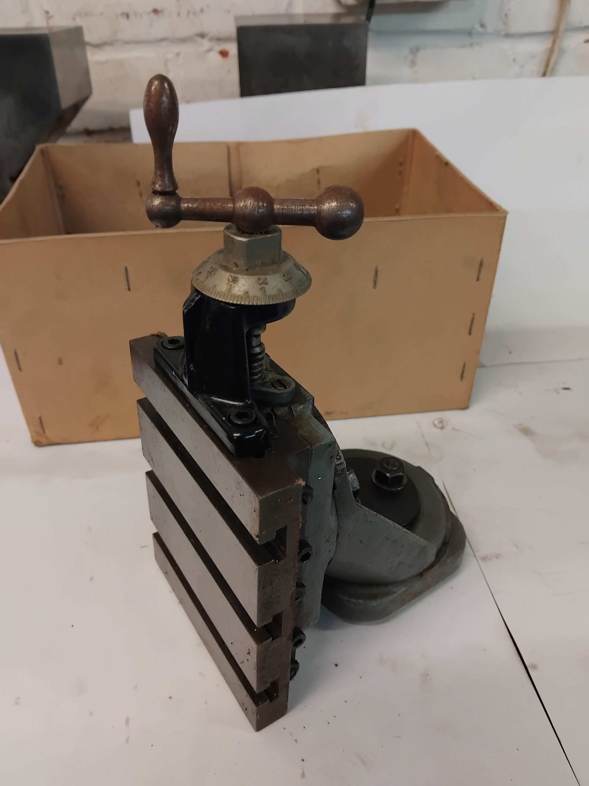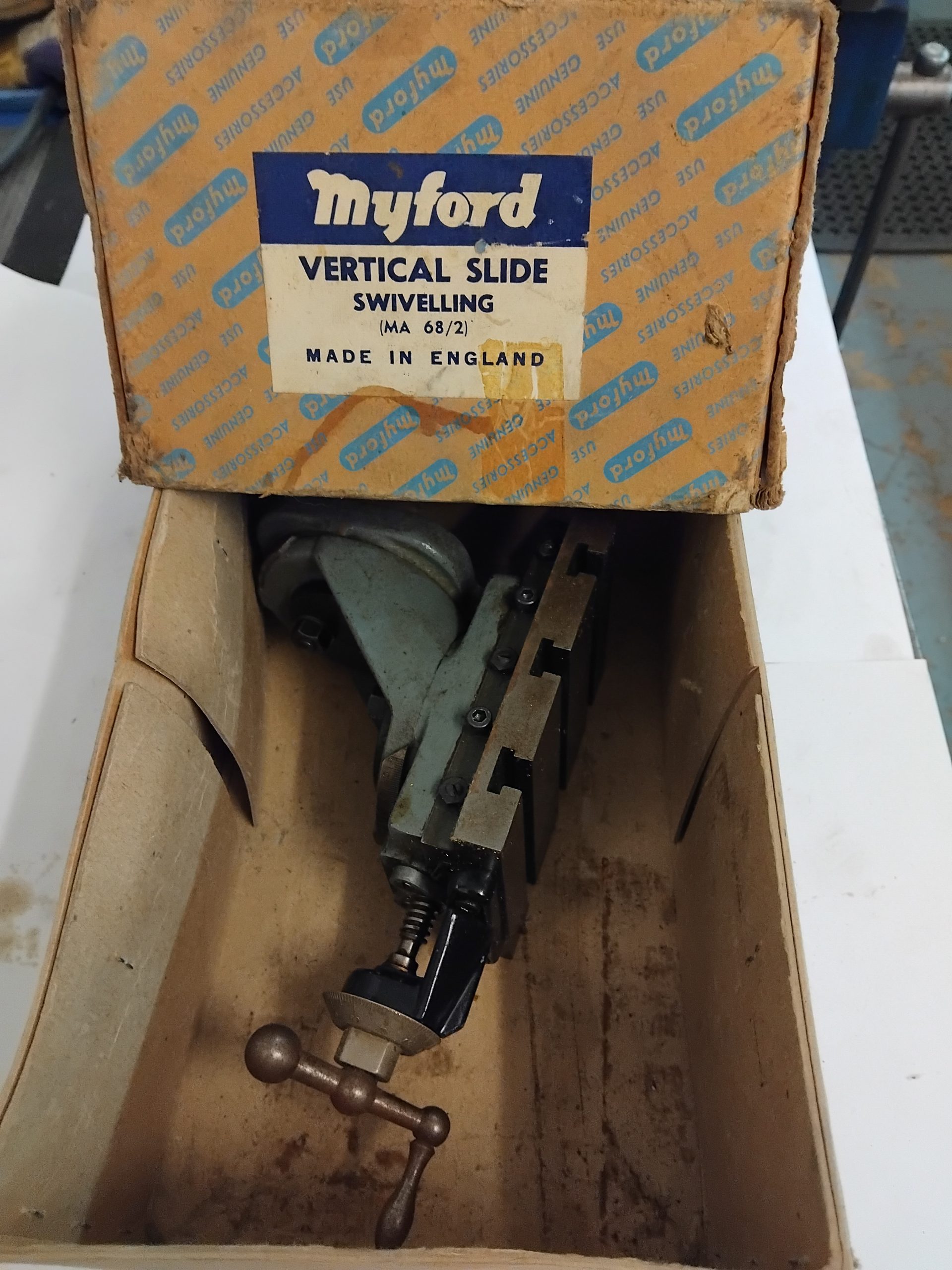 2 way tilting Myford milling slide, usually mounted vertically on the cross slide of a Myford Super 7, ML7 and some of the ML10 models with the mill cutter held in the lathe spindle. Very nice original condition with box.