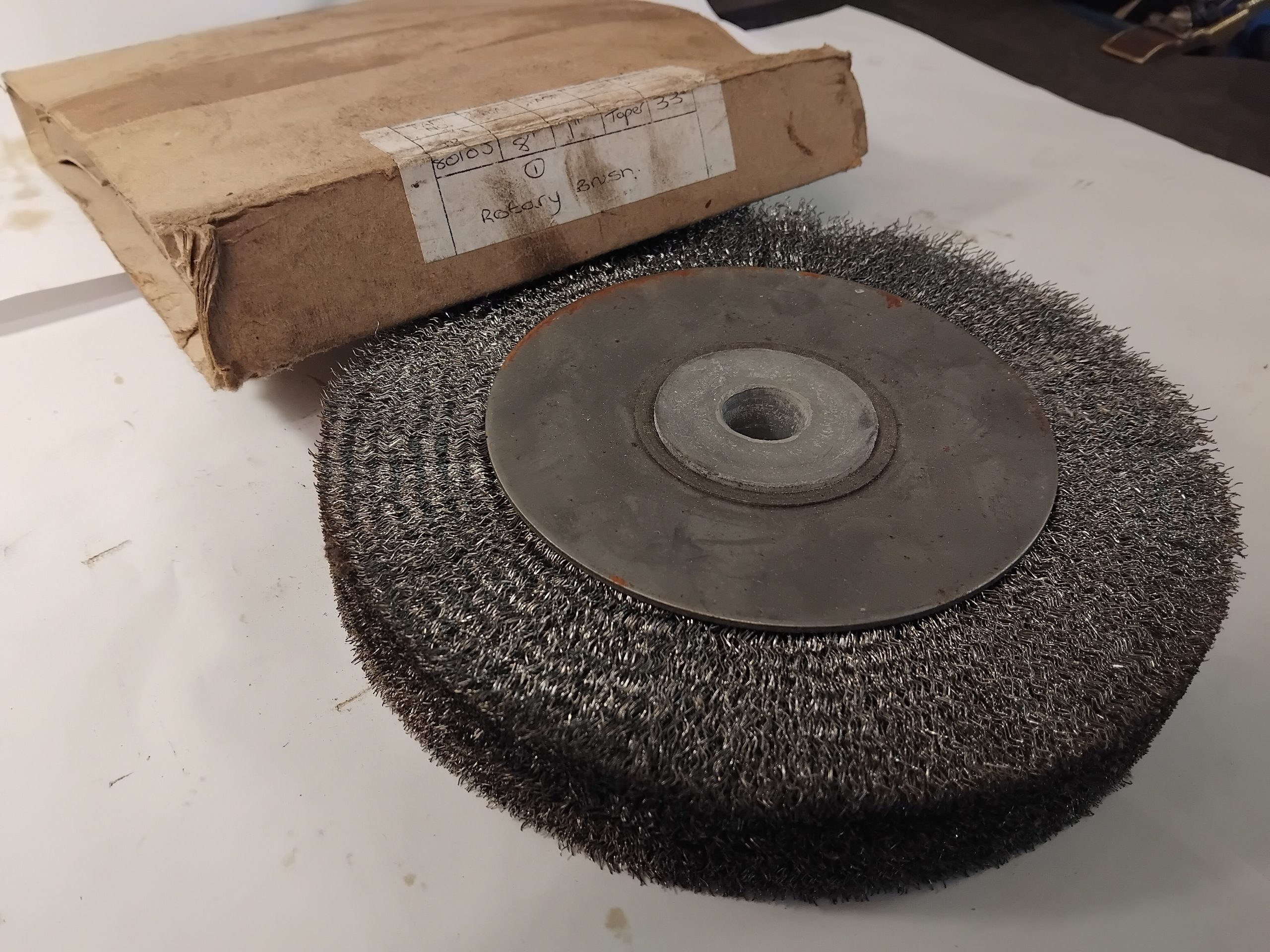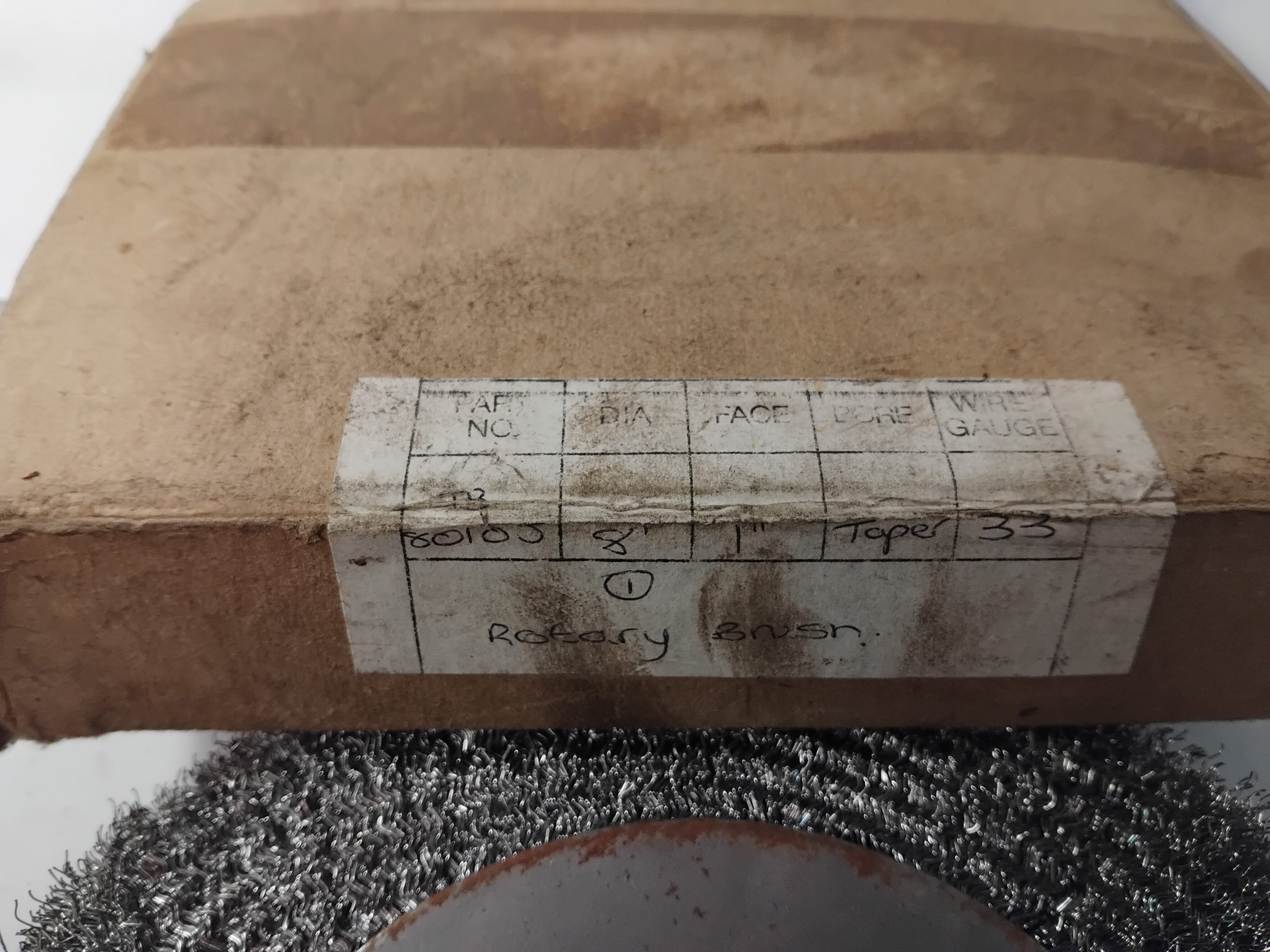 New old stock, quality made (probably British) 8″ x 1″ rotary wire brush with taper centre for use on a pigs tail type mounting, 33 wire gauge. User must wear face/eye protection when using!