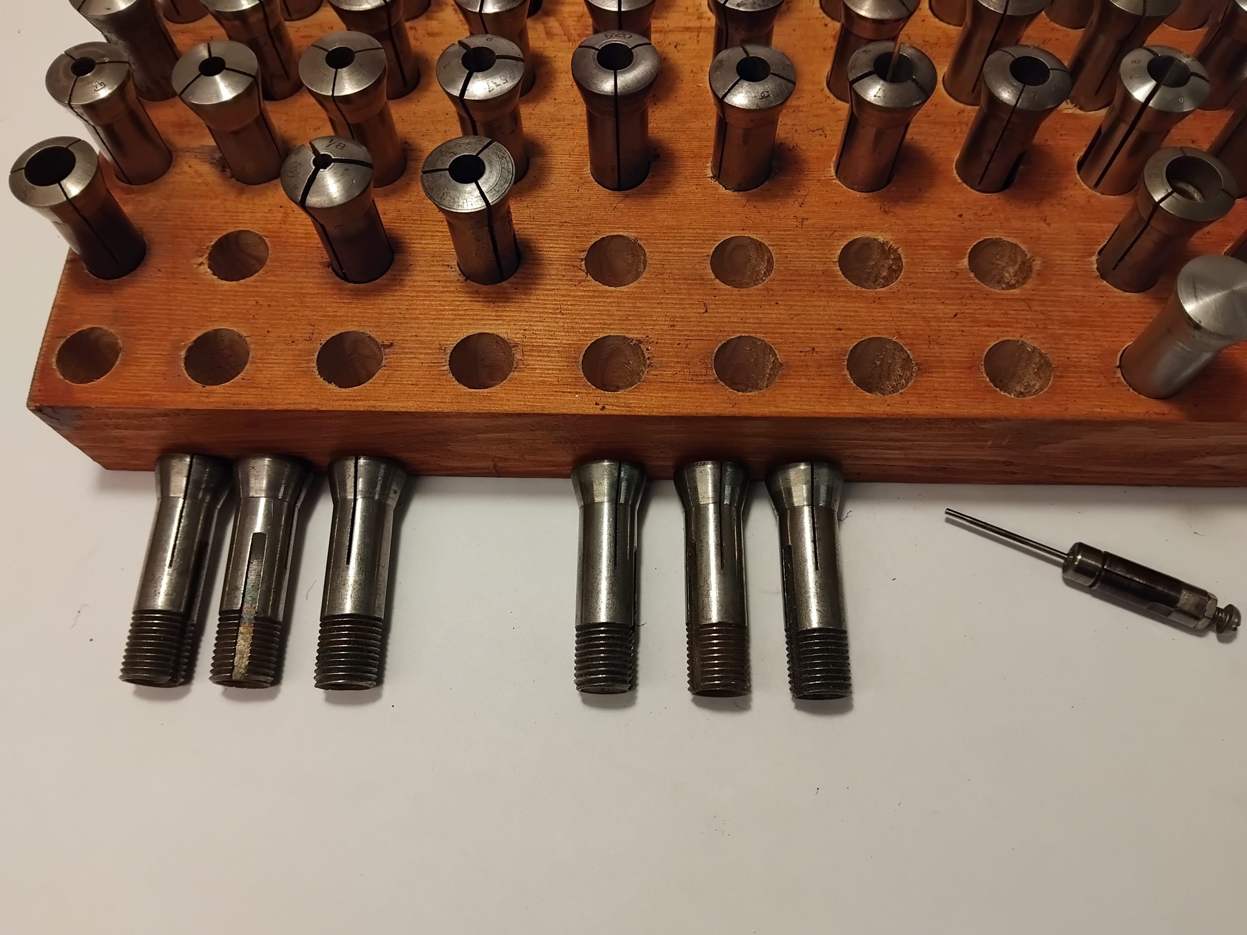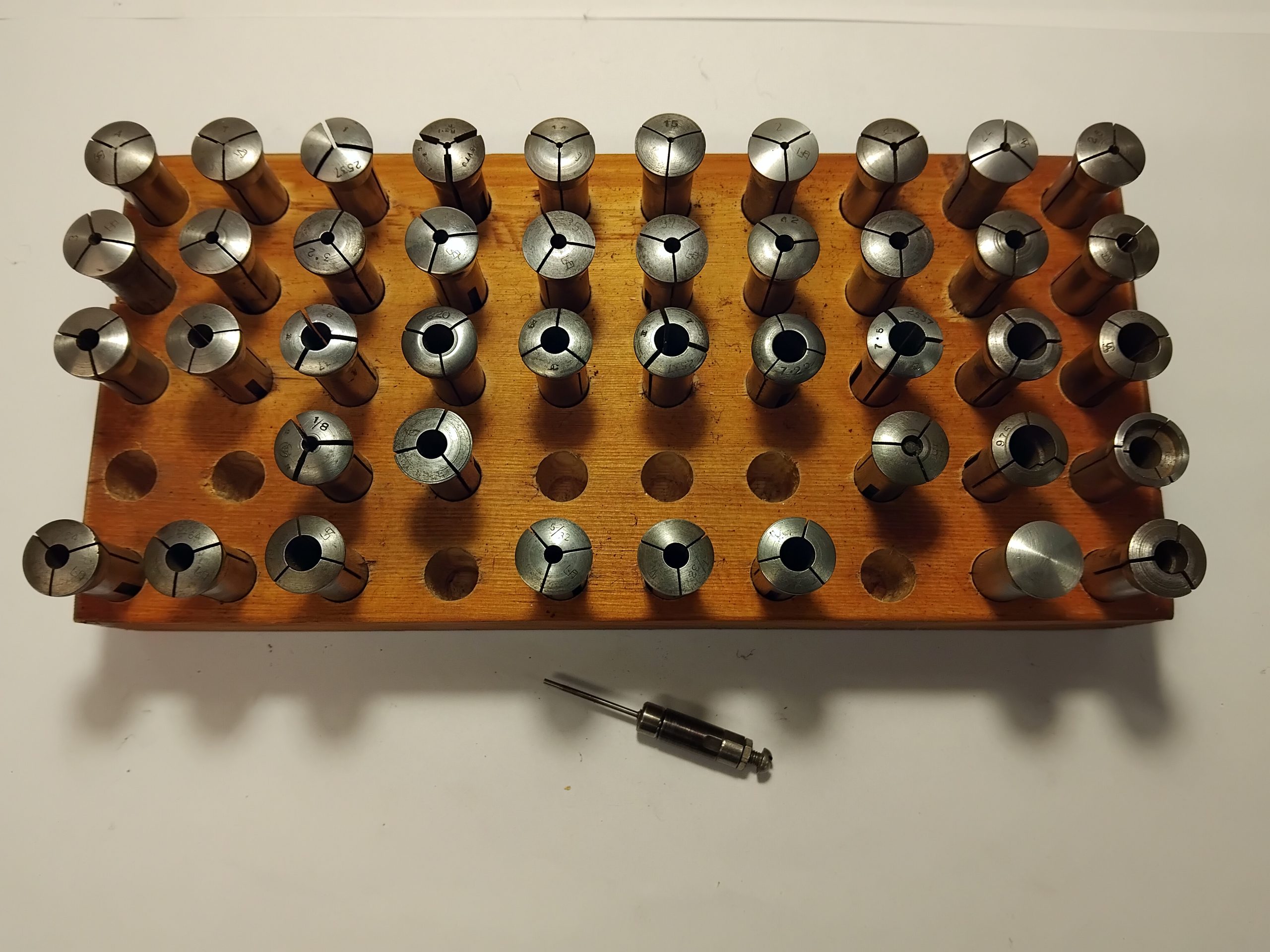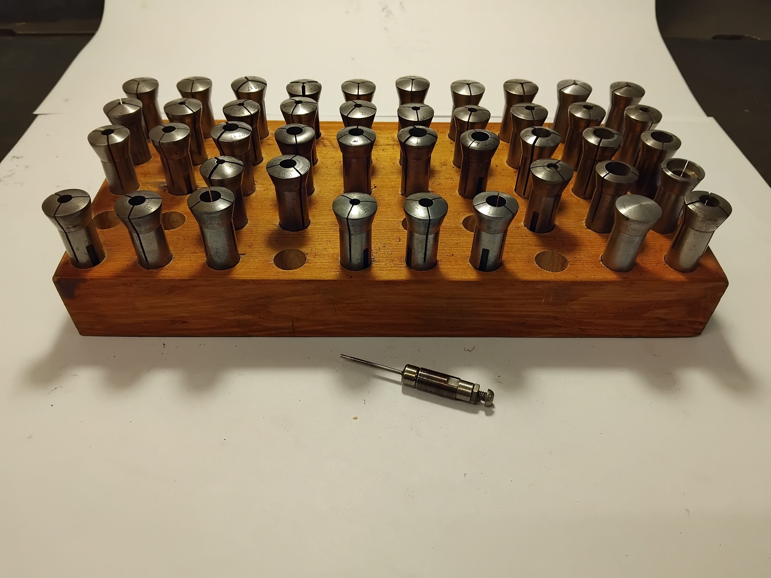 Job lot of mostly metric W12 collets as follows: along the top three rows .4, .7, 1, 1.2, 1.4, 1.5, 2, 2.1, 2.4, 2.5, 3, 3.1, 3.2, 3.3, 3.5, 3.7, 4.2, 4.3, 4.7, 4.8, 5, 5.5, 6, 6.2, 6.4, 7, 7.25, 7.5, 8.5, 9.25. Forth row to the left is 1/8 & 1/4, Fifth row row to the left is 13/64, 15/64, 19/64, 5/32, 7/32, 9/32 + to the right bottom corner is 5 off soft blank collets (one new). Totalling 43 off collets + a depth gauge & the wooden block stand. All in used nice condition, Sold as one lot, I will only post within the UK.