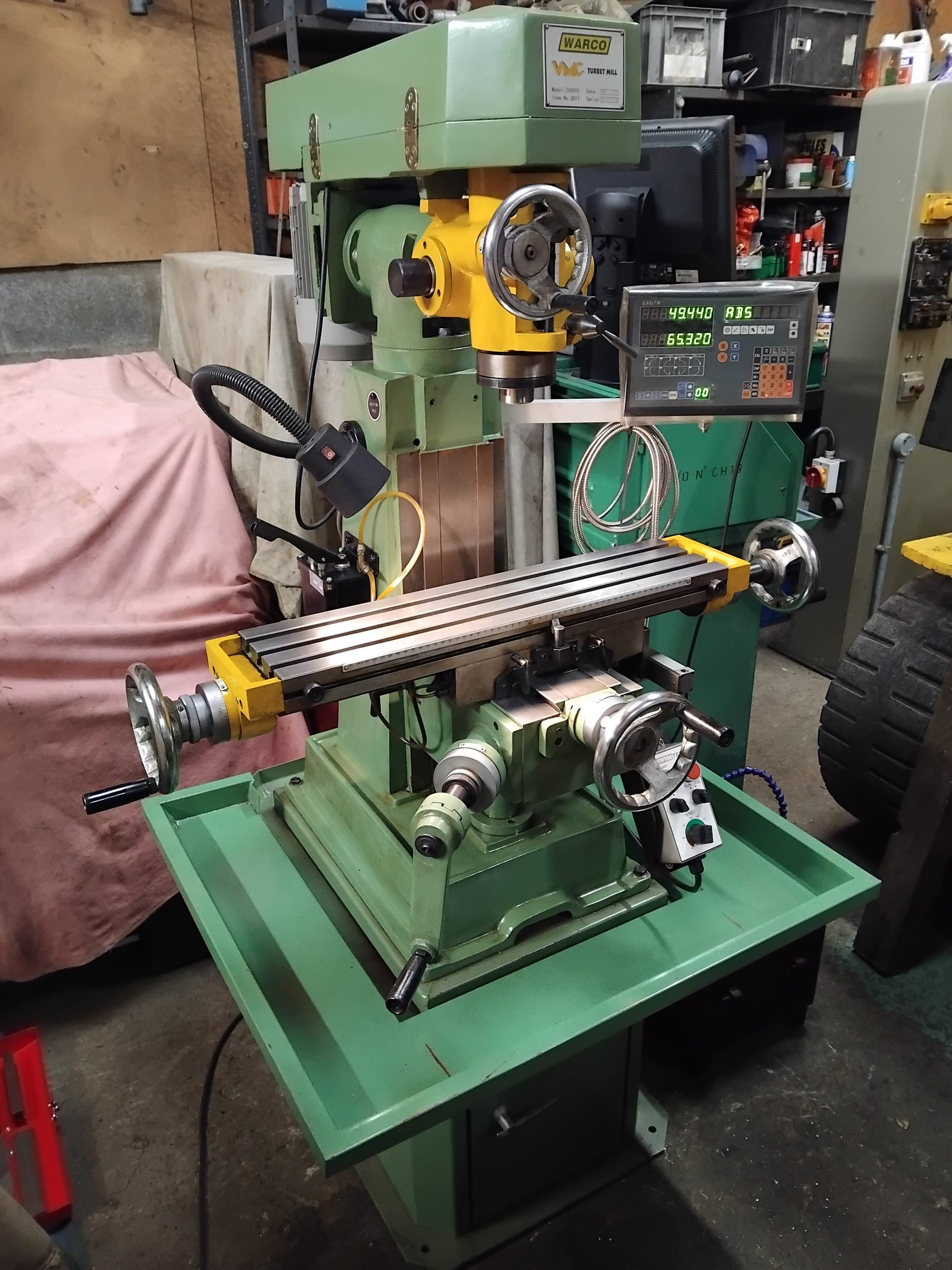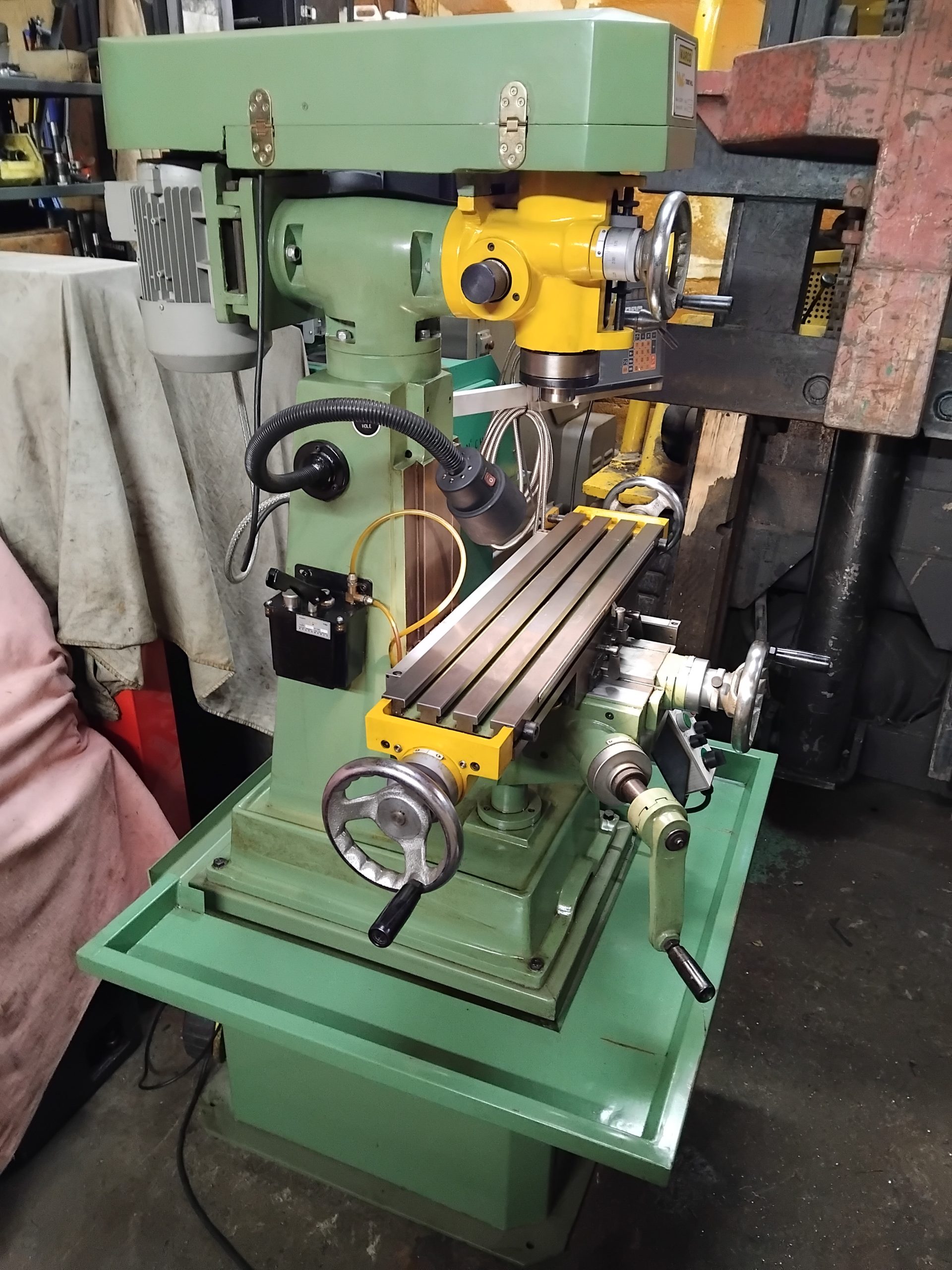 Metric machine with R8 taper, fitted with a Newton Tesla Variable speed control using a Siemens 1.5HP motor and VFD- all driven from 240V mains plug. Also fitted is a DRO, light and one shot lubrication. Machine includes a stand alone 240V coolant system with magnetic base to position the delivery wherever needed plus the extra wide coolant tray. Tooling includes a 100mm swivel vice, complete clamping set, 13 off R8 collets to cover all the common cutter shanks in Metric and imperial, R8 to 1 and 2MT adapters, fly cutter and multi-tip carbide surface cutter, drill chuck, original toolbox with 2 pairs of ground parallels, spanners, spare new belts etc.